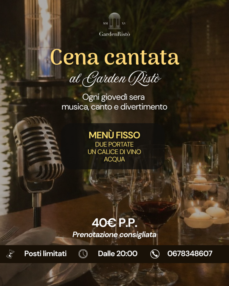 Posted in Menù Festività Cena cantata al Garden Ristò Giovedi 22 Gennaio – Cena Cantata Menù fisso e accompagnamento musicale pensati per lasciarsi andare e vivere il giovedì con leggerezza e stile Garden Ristò Via Appia Antica 172, Roma 06 78348607 www.gardenristo.net On Gennaio 22, 2026 Via Appia Antica, 172 - 00179 Roma