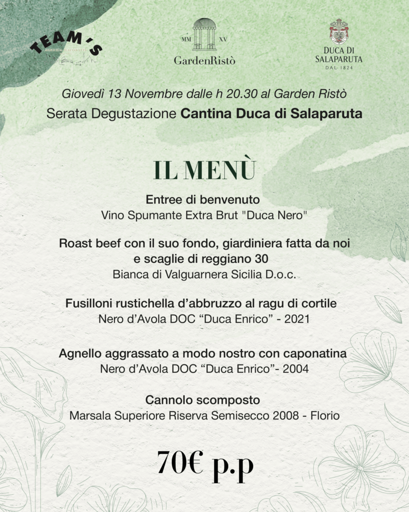 Posted in Degustazioni Serata degustazione Duca di Salaparuta 𝗤𝘂𝗮𝗻𝗱𝗼 𝗹𝗮 𝗰𝘂𝗰𝗶𝗻𝗮 𝗶𝗻𝗰𝗼𝗻𝘁𝗿𝗮 𝗹𝗮 𝘁𝗿𝗮𝗱𝗶𝘇𝗶𝗼𝗻𝗲 𝗲𝗻𝗼𝗹𝗼𝗴𝗶𝗰𝗮 𝗻𝗮𝘀𝗰𝗲 𝘂𝗻𝗮 𝗺𝗮𝗴𝗶𝗮. Giovedì 13 Novembre lasciati guidare da Garden Ristò e Duca di Salaparuta in una serata di profumi, abbinamenti e piaceri veri. Un menù unico, un calice per ogni emozione Garden Ristò | ore 20.30 70€ p.p. | Posti limitati On Novembre 13, 2025 Via Appia Antica, 172 - 00179 Roma