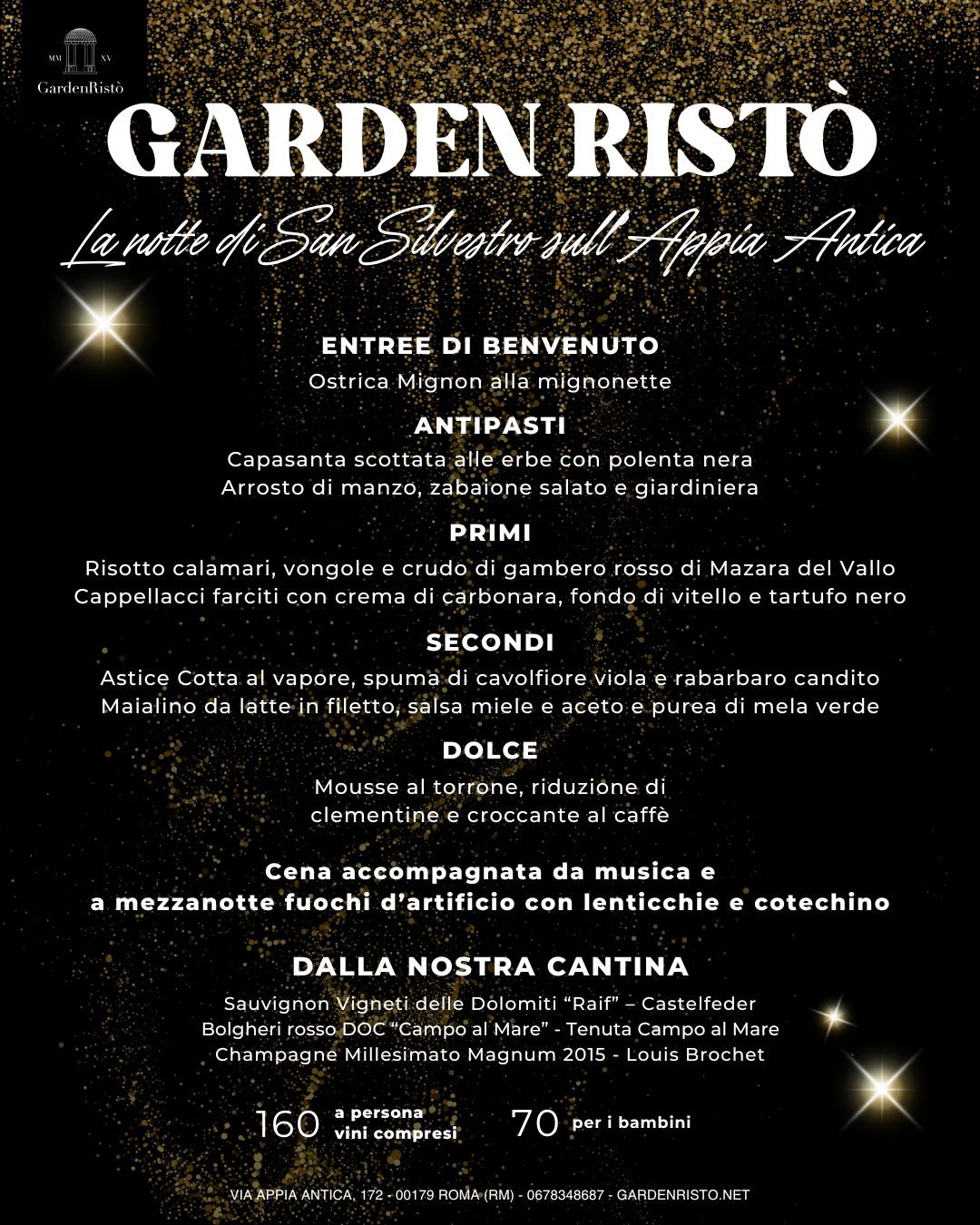 Per il Capodanno 2026, Garden Ristò ti accoglie in un’atmosfera raffinata, tra luci dorate, musica e sapori pensati per celebrare al meglio l’arrivo del nuovo anno.